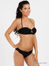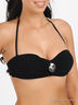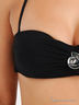 Оригинальный купальник из тонкого эластичного материала. Бюстгальтер балконет на косточках с поролоновой чашкой. Завязывается на спине и через шею на съемную завязку, дополнен кармашками для поролоновых вкладышей. Трусы слипы с драпировкой на передней части. На бюстгальтере декоративный металлический элемент.