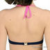 Оригинальный купальник из тонкого эластичного материала. Бюстгальтер на косточках с поролоновой чашкой. Завязывается через шею, на спине металлическая застежка, дополнен кармашками для поролоновых вкладышей. Трусы слипы декорированы контрастной вставкой с металлической деталью.
