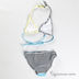 Мягкий трехцветный лиф-бикини завязывается на шее и спинке. Двухцветные трусики с нашивкой спереди.