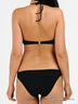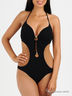 Слитный купальник с плотными чашечками на косточках. Бретели завязываются на шее. Металлическая застежка на спине. Купальник декорирован металлическими кольцами со стразами.