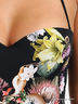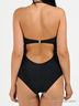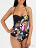 Слитный купальник с плотными чашечками на косточках с отстегивающейся бертелью-петлей. Металлическая застежка на спине. Купальник декорирован купонным набивным рисунком.