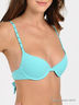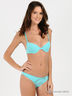 Раздельный купальник из тонкого эластичного материала. Бюстгальтер на косточках с поролоновой чашкой с эффектом push-up завязывается на спине. Бретели можно носить как в классическом виде, так и завязать через шею. Трусы слипы декорированы стразами.