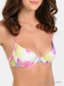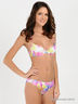 Раздельный купальник из тонкого эластичного материала. Бюстгальтер на косточках с поролоновой чашкой завязывается через шею на скрученную тесьму, застегивается на металлическую застежку на спине. Трусы слипы - пояс и пройма на резинке. Купальник декорирован оригинальным ярким принтом.