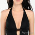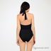 Слитный купальник из эластичной ткани. 2 ленты, завязывающиеся вокруг шеи. Закрытый лиф с вытаскивающимся уплотнителем, вертикальный шов. Лиф декорирован присборенной лентой и бисером."Трусики" -слипы.