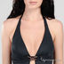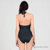 Слитный купальник из эластичной ткани. 2 ленты, завязывающиеся вокруг шеи. Закрытый лиф с вытаскивающимся уплотнителем, вертикальный шов. Лиф декорирован присборенной лентой и бисером."Трусики" -слипы.