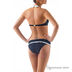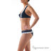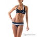Раздельный купальник с мягкой чашкой на кости. Бретели завязываются на шее. Бюст с декоративными складками украшен рюшами. Плавки - слипы, также декорированы "юбочкой" с рюшами.
