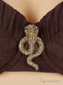 Шикарный раздельный купальник. Бюст – формованный балконет из тонкого поролона на кости с отстегивающимися бретелями и оригинальной драпировкой по лифу, по центру украшен эффектной брошью-коброй, инкрустированной стразами. Классические плавки со средним боком. Модель выполнена из новейшей итальянской ткани Eurojersey Sensitive Leather, которая создает эффект замши.