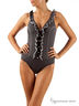Дамский слитный купальник. Верх купальника — мягкие плавающие чашки, декорированы кокетливыми воланами и изящными миниатюрными пуговицами в стиле кубинских национальных костюмов. По задней детали изделие украшено глубоким вырезом. Купальник выполнен из итальянской ткани Eurojersey, которая не теряет своих качеств в соленой и хлорированной воде.