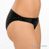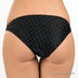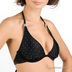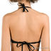Классический купальник "бикини" черного цвета в мелкий белый горох. Лиф завязывается на шее и спине. Тонкие лямки декорированы металлическим украшением. Мягкие чашечки на косточках. Трусики слипы.
