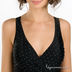 Выполнен из эластичного, приятного на ощупь материала в мелкий белый горох. Запах спереди декорирован крупной брошью в стразах.