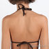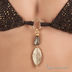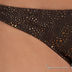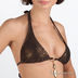 Бикини шоколадно-коричневого цвета с бронзовым переливающимся принтом. Лиф завязывается на шее и спине. Треугольные мягкие чашечки позволяют идеально подогнать размер под Вашу грудь. Чашечки соединены золотистой подвеской. Трусики слипы.