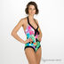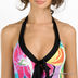 Смелый и яркий сдельный купальник "халтер". Он хорошо поддерживает грудь, плечи кажутся более широкими и уравновешивают полные бедра, а яркий принт скрадывает недостатки фигуры. Завязывается на шее. Мягкие чашечки посередине завязываются на бант, что позволяет идеально подкорректировать купальник под Вашу грудь. Спереди имитация карманов с клапанами с крупными желтыми пуговицами.