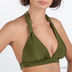 Раздельный купальник "бикини" насыщенного зеленого цвета из лоснящегося, приятного на ощупь материала будет прекрасно смотреться на загорелой коже. Лиф завязывается на шее и спине. Треугольные чашечки идеально подойдут женщинам с большой грудью. Трусики слипы.