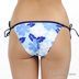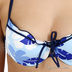 Оригинальный купальник из тонкого эластичного материала. Бюстгальтер на косточках с поролоновой чашкой, с завязками на спине и через шею. Внутри кармашки для съемных вкладышей, которые идут в комплекте. Трусы танга с завязками по бокам. Купальник декорирован оригинальным принтом.