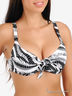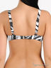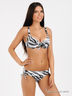 Оригинальный купальник из тонкой шелковистой эластичной ткани. Лиф с поролоновыми чашечками на косточках застегивается на спине на металлическую застежку. Дополнен съемными поролоновыми подушечками для создания эффекта push-up. Бретели регулируются по длине. Трусы слипы дополнены кулисками по бокам. Проймы и пояс на резинке, передняя часть и ластовица на подкладке. Купальник декорирован оригинальным принтом.