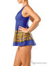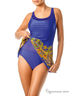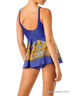 Популярный купальник-платье для женщин разного возраста. Сложное конструктивное решение. Анатомический крой купальника с утягивающей сеткой Power net внутри и сарафан-трапеция с комфортным круглым вырезом снаружи позволяет идеально корректировать линии фигуры. Модель выполнена в сложной технике поместного расположения принта и детального золотого фольгирования. Эффектный рисунок в ярких тонах 'Золотые кружева' на ярко-синем.