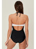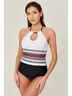 Женственный слитный купальник из эластичного материала с актуальными контрастными полосками.