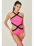Выполнен из эластичного материала неонового розового цвета с отделкой из чёрной эластичной ленты.
