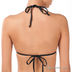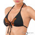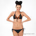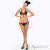 Раздельный купальник. Чашечки с тонкими съемными уплотнителями. Завязывается сзади и на шее. Трусики слипы с завязками по бокам. Украшен принтом и бусинами.