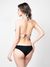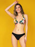 Очаровательная купальная пара с треугольными чашками на поролоне с эффектом "Push-Up". Элегантная форма бескаркасных чашек плавно переходит в широкие завязки, подчеркивая соблазнительную линию декольте. Плавки бразилиано с задним швом выигрышно подчеркивают особенности фигуры. Оригинальное сочетание тропического принта и однотона возводит эту модель на вершину пляжных тенденций!