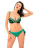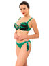 Купальный костюм. Бюстгальтер с формованными чашками. Верхний срез стана обработан однотонной обтачкой, переходящей в регулируемые бретели. По боковому срезу мягкая сборка. Трусы-танга с низкой посадкой из однотонного полотна, на завязках сбоку. Завязки из полотна с принтом.