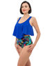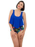 Купальный костюм Бюстгальтер-топ с формованными вкладышами, спереди на широких бретелях, сзади тонкие двойные бретели с регулировкой. Трусы с высокой линией талии. Легкая сборка по боковому шву.
