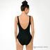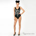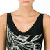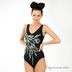 Классический цельный купальник из эластичного материала без подкладки. Внутри вшиты чашечки. Есть выточки. Спереди принт, украшенный стразами.