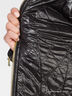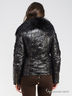 Короткая стеганная куртка-пуховик на гусином пуху, с длинными рукавами, украшенными металлической молнией и съемным воротником из меха енота. Куртка украшена фигурной прострочкой в зоне лифа и в области карманов, потайными неглубокими карманами, металлической молнией и декоративной функциональной шнуровкой по спинке изделия.