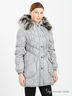 Куртка на молнии, молния закрыта планкой с кнопками, по капюшону мех, на руковах и по талии вставлен ремень из ткани
