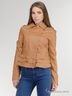 Короткая однотонная куртка с классическим воротником, длинными рукавами и застежкой на молнию и кнопки. Декорирована модель отрезной линией талии, дополнена мелкими рюшами по нижнему канту. Выполнена из "эко-кожи". Отличный вариант для повседневного использования.