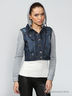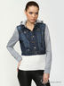 Комбинированная короткая джинсовая куртка с длинными трикотажными рукавами и капюшоном. Декорирована: металлическими пуговицами, накладными карманами, контрастной прострочкой и потертостями "под винтаж". Отличный вариант для повседневного использования.