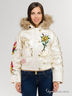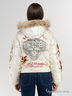 Стеганная короткая куртка с длинным рукавом и капюшоном с меховой отделкой. Украшена оригинальным принтом Ed Hardy с изображением головы тигра, драконов, бабочек, цветов и стразами, функциональным поясом на металлической пряжке и выпуклыми пуговицами с изображением логотипа бренда.
