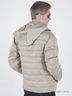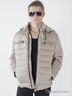 Пуховик короткий, центральная застёжка - молния, воротник – стойка из основной ткани, капюшон отстегивается, карманы прорезные на молнии, два нагрудных прорезных кармана на молнии, в рукавах трикотажные манжеты, утеплитель пух.