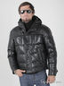 Стильный мужской пуховик, короткий, выполненный из мягкой экокожи, центральная застёжка – молния закрыта ветрозащитной планкой на кнопках. Куртка имеет два нагрудных прорезных кармана на молнии, и два боковых прорезных кармана на кнопках. На левом рукаве расположен накладной карман на молнии. Капюшон не отстегивается, внутренняя часть стойки капюшона отделана трикотажем. Куртка имеет несколько внутренних карманов, в рукавах трикотажные манжеты.
