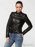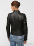 Мотоциклетная кожаная куртка на металлической молнии, с воротником- стойкой и скрытыми карманами. Декорирована модель фигурной прострочкой в виде накладных деталей на погонах, в зоне пояса, локтей и менжетов рукавов.