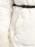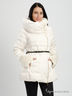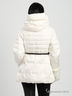 Оригинальный, удлиненный пуховик прилегающего силуэта со смещенной застежкой-молнией и таким же смещенным центром капюшона. Контрастные по цвету молнии на застежке и карманах.