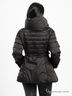 Оригинальный, удлиненный пуховик прилегающего силуэта со смещенной застежкой-молнией и таким же смещенным центром капюшона. Контрастные по цвету молнии на застежке и карманах.