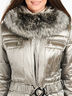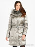 Детали: отложной воротник с отстегивающимся мехом енота, длинные рукава, застегивается на молнию и кнопки, спереди 2 прорезных кармана на молнии, внутри 1 карман, талия на поясе с металлической пряжкой