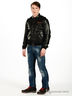 Детали: втачной отложной ворот на стойке с пуговицей, погоны на плечах в качестве отделки, длинный рукав посажен на трикотажную манжету-резинку с вставкой из кожи с застежкой на пуговице, два накладных кармана с клапаном на пуговице и два прорезных боковых кармана, застежка на пуговицах, пояс изделия выполнен трикотажной-резинкой, два внутренних прорезных кармана на молнии, по поясу небольшая сборка, на спинке и на груди небольшая нашивка в виде логотипа бренда, на подкладке куртки изображение самолета.