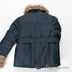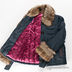 Куртка на синтепоновом подкладе прямого кроя. Застегивается на пуговицы. Отложной воротник и длинный прямой рукав декорированы искусственным мехом. Два врезных кармана.