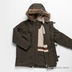 Теплая куртка на синтепоновом подкладе из плотной хлопковой ткани, прямого кроя. Застегивается на молнию и пуговицы. Капюшон с искусственным мехом. Длинный прямой рукав дополнен трикотажной резинкой в рубчик. В пояс продета резинка на карабине, регулирующая ширину изделия. Два врезных кармана с клапаном на кнопке. Сзади низ изделия дополнен молнией.