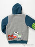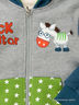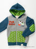 Теплая и мягкая куртка из флиса средней плотности, утепленного начесом. Центральная застежка на молнии. Длинные рукава с накладками в районе локтей. Трикотажная манжета по низу изделия и на рукавах. На полочках два накладных кармана. На полочках и спинке красочные печатные рисунки и аппликация.