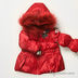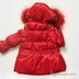 Удлиненная стильная куртка для девочки красного цвета. Застегивается на молнию, имеет съемный капюшон с меховой отделкой.