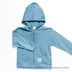 Куртка из тонкой трикотажной ткани с капюшоном. Застегивается на молнию. Длинный прямой рукав и низ изделия на трикотажной резинке в мелкий рубчик. Два кармана.
