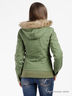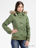Куртка с длинными рукавами и воротником стойкой. Застежка на молнию и пуговицы. Изделие дополнено капюшоном, декорированным мехом.