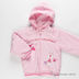 Мягкая демисезонная куртка на флисе. Верх из тонкой мягкой плащевки. Застежка на молнию, капюшон декорирован оборками. Трикотажные манжеты в мелкий рубчик. Два кармана. Декорирована аппликацией.