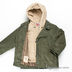 Зеленая куртка прямого кроя застегивается на молнию и кнопки. Два передних кармана. Внутренняя курточка с трикотажными манжетами и капюшоном.