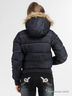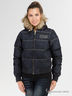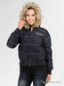 Укороченный женский пуховик из джинсовой ткани с водоотталкивающей пропиткой. Манжеты и низ куртки отделаны трикотажной резинкой в рубчик. С капюшоном, отделанным искусственным мехом.