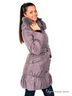 Удлиненная куртка приталена поясом с пряжкой на талии, застегивается на молнию и кнопки, имеет кулиску на подоле. Рукава и карманы – втачные. Капюшон с опушкой. Расцветка модная и экстравагантная.