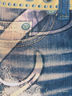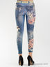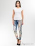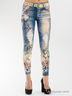 Леггинсы, стилизованные под винтажные джинсы. Леггинсы украшены ярким принтом в виде гитары, цветов и надписей инкрустированных стразами.
